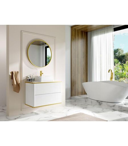 Unique Hangend, geribbeld badkamermeubel met goudkleurige randen en opbouwwastafel - Wit - 80 cm - KELIZA