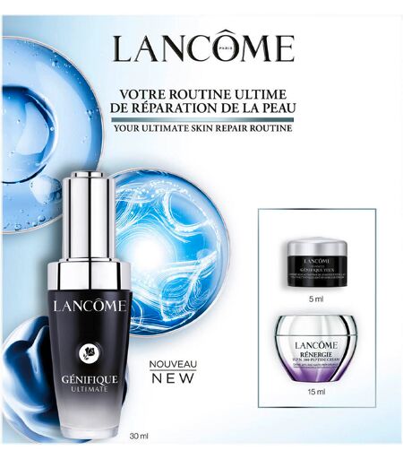 Een huidverzorgingsset met gezichtsserum, dag- en oogcrème voor een herstelde en jonger uitziende huid. Deze set bevat: 1 x Genifique Ultimate Serum, 30 ml1 x Genifique Nieuwe Oogcrème, 5 ml1 x Rénergie Nieuwe Crème, 15 ml Génifique Ultimate Serum: Het nieuwe Génifique Ultimate Serum maakt gebruik van de beta-glucan CM-technologie, waarvan bekend is dat deze het huidherstel versnelt. In combinatie met hyaluronzuur, zoethoutextract en onze iconische pre & probioticafracties, biedt deze formule de ultieme hersteloplossing die de zichtbaarheid van roodheid, fijne lijntjes en een gladdere huid verbetert. Ultieme resultaten voor de algehele kwaliteit van je huid, herstel van je huidbarrière en vroege tekenen van veroudering: -28% fijne lijntjes*+22% gladheid*-33% roodheid***Klinisch onderzoek, 50 vrouwen, 8 weken **Klinisch onderzoek, 75 vrouwen, 8 weken Advanced Génifique Eye Cream: Dagelijks en 's nachts gebruiken, werkt op de zichtbare tekenen van jeugdige, stralende ogen: hydrateren van je oogcontour, gladheid, helderheid, donkere kringen en fijne lijntjes onder je ogen. Rénergie H.P.N. 300-Peptidencrème: Een unieke concentratie hyaluronzuur, onze ontdekking van 300 soorten peptiden en de kracht van niacinamide in één hoogwaardige anti-verouderingscrème. Uitzonderlijke resultaten, bevestigd door alle klinische parameters: +27% lifting***-21 % rimpels***-22 % pigmentvlekken******Klinische resultaten van 8 weken, 84 vrouwen, verschillende fototypes en etniciteiten. Toepassing: Begin je dagelijkse huidverzorgingsroutine met het Génifique Ultimate gezichtsserum, breng vervolgens je Génifique oogcrème aan op je oogcontour en eindig met je Rénergie H.P.N. 300 peptidecrème, die je aanbrengt op je gezicht en hals. s Ochtends en 's avonds. Aanbrengen van het nieuwe Génifique Ultimate Serum: Breng 's ochtends en 's avonds een pipet vol aan. Schroef de zelfvullende, zeer nauwkeurige pipet los. Plaats de volle pipet in je hand. Masseer het serum in de gereinigde huid na de toner of lotion. ...
