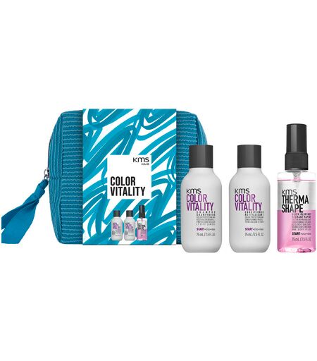 Duik deze zomer in het blauw met de perfecte zomerhelden. Een reisset van shampoo, conditioner en hittebeschermende spray verpakt in een speels reistasje, speciaal ontworpen om je haarkleur te beschermen en je haar er stralend mooi uit te laten zien. Deze set bevat: 1 x Colourvitality Shampoo, 75 ml1 x Colourvitality Conditioner, 75 ml1 x Thermashape Quick Blow Dry, 75 ml COLORVITALITY SHAMPOO: Reinigt mild, beschermt tegen kleurvervaging en houdt de kleur levendig tot wel 20 wasbeurten. COLORVITALITY CONDITIONER: maakt kammen makkelijker, hydrateert en geeft meer glans. THERMASHAPE QUICK BLOW DRY: Verkort de droogtijd met KMS THERMASHAPE Quick Blow Dry, een conditioner die op handdoekdroog haar wordt gesprayd en de droogtijd verkort. Toepassing: COLORVITALITY SHAMPOO: Shampoo. Uitspoelen. COLORVITALITY CONDITIONER: 2 minuten op het gewassen haar aanbrengen. Uitspoelen. THERMASHAPE QUICK BLOW DRY: Goed schudden en op handdoekdroog haar sprayen. Versnelt de droogtijd bij zowel föhnen als aan de lucht drogen. ...