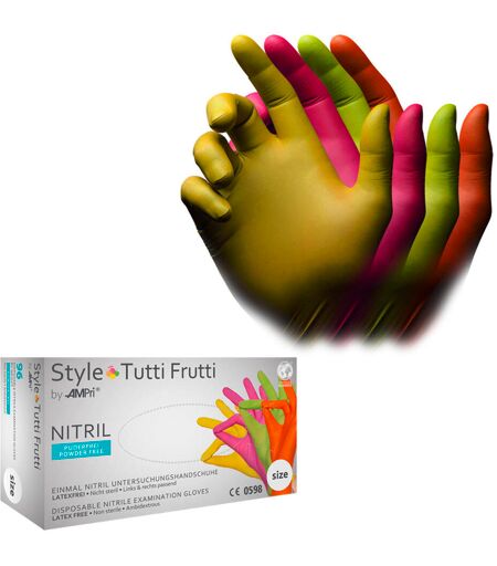 STIJL tutti frutti, nitril onderzoekshandschoen, poedervrij, gemengde kleuren. 240 mm lang, niet-steriel96 stuks - 24 stuks elk in geel, appelgroen, oranje, magentaAQL 1.5, EN ISO 21420, EN 455, EN 374 ...
