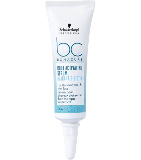 Bonacure Root Activating Serum is speciaal ontwikkeld voor zwak en dunner wordend haar en vermindert niet-pathologische haaruitval*. De unieke combinatie van ingrediënten in de snel absorberende, vrij van*** en vegan**** formule met superfood complex activeert de haarwortels** en stimuleert de hoofdhuid. Verrijkt met guarana en biotine, geeft het meer body en verbetert het de kwaliteit en vitaliteit van het haar. De hoofdhuid wordt opnieuw in balans gebracht en de toekomstige conditie van het haar wordt verbeterd. Geschikt voor dagelijks gebruik. *Verhoogde proportie haarfollikels **Regelmatig gebruik, als combinatie van Root Activating Shampoo en Serum ***Vrij van natriumlaurylsulfaat & natriumlaurethsulfaat, siliconen en kunstmatige kleurstoffen ****Vrij van ingrediënten van dierlijke oorsprong Toepassing: Vochtig of droog haar in secties verdelen en tweemaal daags aanbrengen. Het Root Activating Serum gelijkmatig over de hoofdhuid verdelen en zachtjes inmasseren. Niet uitspoelen. De nieuwe hoofdhuidverzorgingslijn van Bonacure maakt gebruik van de kracht van het Superfood Complex - een mix van supervoeding en huidverzorgingsingrediënten die helpen de hoofdhuid weer in balans te brengen en de toekomstige haarkwaliteit en -conditie te verbeteren. Elk ingrediënt in het Superfood Complex staat bekend om zijn vele voordelen... Bevat vitamine A, B, C, K, antioxidanten, omega-3 en omega-6. Antioxidanten helpen ontstekingen te verminderen, terwijl vetzuren helpen de hoofdhuid te voeden. Madecassoside is een puur actief ingrediënt uit tijgergrasbladeren. Het heeft kalmerende en ontstekingsremmende eigenschappen die de huid helpen te kalmeren, terwijl de hydraterende eigenschappen het vochtgehalte van de huid verbeteren. Superbessen geven een boost aan antioxidanten en vitaminen. Ze helpen de beschermlaag van de huid te versterken en verhogen de weerstand dankzij hun ontstekingsremmende eigenschappen. AHA (alfahydroxyzuur) verwijdert vuil en verontreinigende stoffen terwijl het de hoofdhuid hydrateert. Het breekt dode huidcellen af om het natuurlijke vochtgehalte van de huid te verbeteren. Guaraná bevat bijna twee keer zoveel cafeïne als een normale koffieboon. Het hoge gehalte aan antioxidanten helpt de haarzakjes te stimuleren. Biotine is een in water oplosbare vitamine die het lichaam helpt vetten, koolhydraten en eiwitten te metaboliseren. Het draagt bij aan de eiwitsynthese en in het bijzonder aan de keratineproductie en helpt zo de kracht en vitaliteit van het haar te vergroten. ...