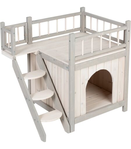 Sprookjesachtig en buitengewoon kattenhuis met dakterras - een droomachtige slaapplek voor veeleisende katten, met trap, ook geschikt voor kleine honden, kleur: grijs/wit. ...