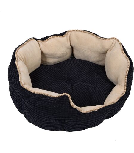 Uiterst knus, rond sluimerbedje met een bijzonder hoge rand met gouden sierkoort en praktisch draaibaar kussen - Wasbaar tot 30 graden. Kleur: Zwart / Beige. ...