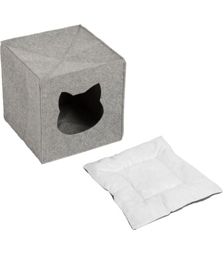 Kubusvormig kunstvilten hol. Opvouwbaar en stevig door geïntegreerde stangen. Kattenkop-ingang. Met wasbaar, tweekleurig wendbaar kussen. Ook passend voor IKEA Kallax- en Expedit-kasten. Kleur: grijs ...