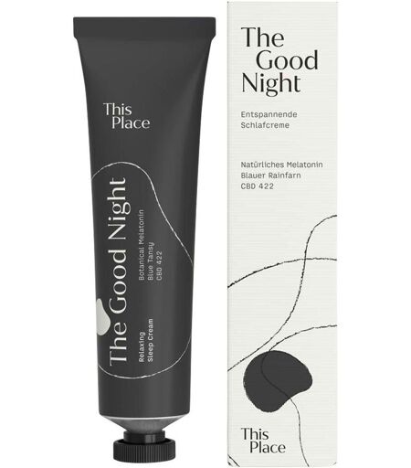 This Place The Good Night is een ontspannende slaapcrème. Zware gedachten, lange dagen, veel stress. Het is moeilijk om in slaap te vallen. Als je op zoek bent naar een plantaardige zachte ondersteuning, dan heb je die gevonden. Want met de innovatieve slaapcrème The Good Night integreer je een moderne crèmeformule in een avondprogramma dat je helpt om op natuurlijke wijze in slaap te vallen. Kruiden melatonine in combinatie met rustgevende geuren helpen u te ontspannen in de slaap, adem voor adem. ...met de natuurlijk krachtige ingrediënten: Uit kruiden gewonnen melatonine kan helpen om de tijd die nodig is om in slaap te vallen te verkorten en zo een rustgevende slaap te ondersteunen.Cannabidiol (CBD) wordt beschouwd als stressverlagend en kalmerend.De krachtige triade van ontspannende geuressences van lavendel, palo santo en blauwe tansy helpen je te kalmeren bij elke diepe ademhaling.Berkenextract kan de genezingsprocessen in uw lichaam ondersteunen. This Place gebruikt veganistische formules die vrij zijn van siliconen, minerale olie, PEG's, parabenen en plastic. Toepassing: Neem de gewenste hoeveelheid van The Good Night ongeveer 30 minuten voor het slapen gaan. Verdeel het gelijkmatig over de achterkant van je nek en over je onderarmen met zachte bewegingen. Door de aangenaam warme geur rustig in te ademen met gesloten ogen kun je het ontspannende effect versterken. Hoewel The Good Night een lichaamscrème is, kun je hem dankzij de rijke samenstelling ook gebruiken als voedende gezichtscrème. ...