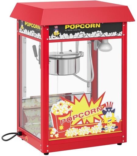 Wat is rood, retro en een absolute blikvanger? Deze popcornmachine van Royal Catering! Zijn stijlvolle ontwerp met rood geëmailleerd dak is een echte hit. Hij beschikt ook over een verwarmde en verlichte kamer, een mengsysteem en een automatische thermostaat. De popcornmachine werkt met een vermogen van 1500 W en bereikt snel de bedrijfstemperatuur. De krachtige motor zorgt voor een gelijkmatige warmteverdeling in de machine, zodat de korrels gelijkmatig opwarmen en knallen. Met het apparaat maak je 16 l popcorn per uur (ongeveer. 5 kg/h) - ideaal voor commercieel gebruik om snel veel popcorn te maken. Of het nu gaat om zoete of zoute popcorn - beide zijn mogelijk met de popcornmaker. De machine werkt met 2 verschillende temperaturen. Gebruik voor popcorn met suiker de lagere temperatuur van 195 °C, voor klassieke popcorn raden we 235 °C aan. Dit maakt de popcornmachine bijzonder geschikt voor snackbars in bioscopen, bij allerhande evenementen of voor grote feesten. Onze aanbeveling voor knapperige popcorn: gebruik kokosolie, omdat deze bestand is tegen temperaturen tot 240 °C zonder aan te branden. Een echt pluspunt: de pan heeft een antiaanbaklaag, waardoor de popcorn niet aanbrandt. Dit maakt schoonmaken makkelijker, verlaagt de kosten en maakt de snack lichter, omdat je minder olie nodig hebt voor je popcorn. De maïsketel heeft ook een roerstaaf die op een minimale hoogte boven de onderkant van de ketel draait om de maïs erin te roeren. Je activeert de roerstand met een aparte knop. De pot heeft een diameter van 18 cm en een diepte van 6 cm. Het handige plastic handvat maakt het makkelijk om de pan te legen en brandwonden te voorkomen. Het lichtgewicht deksel van de maïsketel houdt de temperatuur binnen en zorgt ervoor dat de afgewerkte popcorn gemakkelijk uit de pot in de onderste kamer terechtkomt als je hem kantelt. Om schoon te maken hoeft u alleen maar de ketel uit de kamer te halen. De popcornmachine is gemakkelijk schoon te maken omdat hij gemaakt is van hoogwaardig roestvrij staal en gehard glas. Dit maakt het apparaat zeer robuust en voedselveilig. De popcornmaker heeft een verwarmend kamerlampje. Zo kunt u uw snack altijd perfect in scène zetten, zelfs in een donkere omgeving. Via een transparante deur met magneetsluiting opent u de grote snackkamer. De sluiting houdt het lichte popcorn veilig binnenin en kan anderzijds met weinig moeite snel worden geopend. Nog sneller en zonder de deur te openen, haalt u het popcorn uit de kantelbak onder de kamer. ...