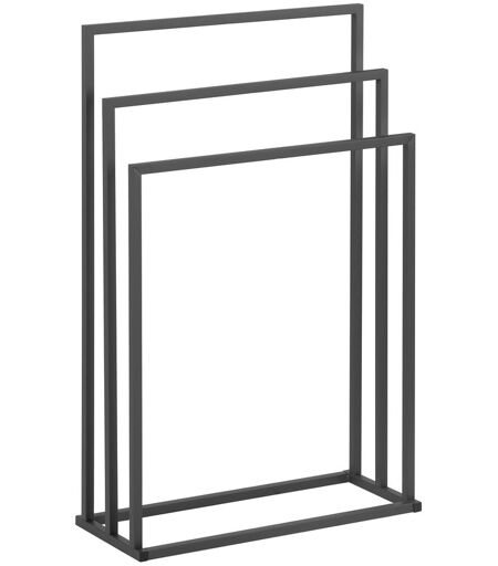 De handdoekhouder van physa hotel supplies biedt een ideale oplossing om handdoeken binnen handbereik te leggen of wasgoed in kleine ruimtes te drogen. Ondanks het kleine formaat bieden drie staven voldoende ruimte - zelfs grote badhanddoeken kunnen worden gedroogd of op de stevige constructie worden neergezet. Het elegante ontwerp biedt maximale benutting van de ruimte in de kleinste ruimtes. De Handdoekhouder met drie balken is ideaal voor krappe en kleine ruimtes. Dankzij de robuuste constructie en een totaal draagvermogen van 6 kg is alles veilig en gemakkelijk bereikbaar. De verspringende spijlen over een breedte van 55 cm zorgen ervoor dat vochtig textiel snel en zonder muffe luchtjes droogt. In hotels, schoonheidssalons of kleedkamers is deze ruimtebesparende en elegante oplossing perfect om handdoeken of ander textiel op een aantrekkelijke en toegankelijke manier te presenteren. Maar ook in eenpersoonshuishoudens als ruimtebesparende wasdroger of in de badkamer om handdoeken te ordenen: deze Staande handdoekhouder is op veel manieren te gebruiken en zorgt voor orde. Dankzij het functionele en elegante ontwerp past de Vrijstaande handdoekhouder naadloos in vrijwel elk inrichtingsconcept. Het donkergrijze, gepoedercoate staal zorgt voor een strakke, hygiënische uitstraling. Deze Staande handdoekhouder maakt het ook gemakkelijker voor u om uw badkamer of keuken goed en verstandig in te richten. De Handdoekhouder maakt indruk met zijn goede kwaliteit: hij is gemaakt van duurzaam staal en is niet alleen decoratief, maar ook gemakkelijk te onderhouden. De bijzondere weerstand tegen roest en mechanische invloeden voorkomt krassen op het oppervlak en geeft het product langdurig een perfecte uitstraling. De stabiliteit van het model wordt gegarandeerd door een uitgebalanceerde constructie. De structuur is eenvoudig: de montageaccessoires zijn al bij de levering inbegrepen voor een snelle en eenvoudige installatie. De instructies leggen ook stap voor stap uit hoe het Handdoekhouder is ingesteld. ...