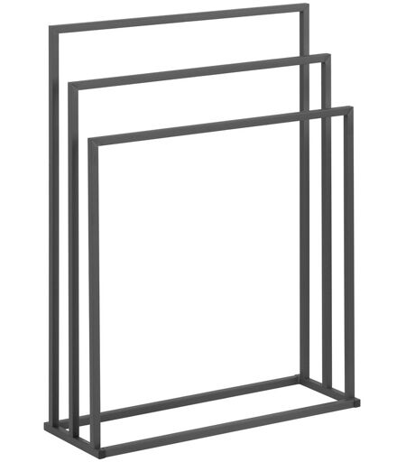 De Handdoekhouder van de hotelbenodigdheden van physa biedt een ideale oplossing om handdoeken binnen handbereik te leggen of wasgoed in kleine kamers te drogen. Ondanks het kleine formaat bieden drie staven voldoende ruimte - zelfs grote badhanddoeken kunnen worden gedroogd of op de stevige constructie worden neergezet. Het elegante ontwerp biedt maximale benutting van de ruimte in de kleinste ruimtes. De Handdoekhouder met drie balken is ideaal voor krappe en kleine ruimtes. Dankzij de robuuste constructie en een totaal draagvermogen van 6 kg is alles veilig en gemakkelijk bereikbaar. De verspringende spijlen over een breedte van 65 cm zorgen ervoor dat vochtig textiel snel en zonder muffe luchtjes droogt. In hotels, schoonheidssalons of kleedkamers is deze ruimtebesparende en elegante oplossing perfect om handdoeken of ander textiel op een aantrekkelijke en toegankelijke manier te presenteren. Maar ook in eenpersoonshuishoudens als ruimtebesparende wasdroger of in de badkamer om handdoeken te ordenen: deze Staande handdoekhouder is op veel manieren te gebruiken en zorgt voor orde. Dankzij het functionele en elegante ontwerp past de Vrijstaande handdoekhouder naadloos in vrijwel elk inrichtingsconcept. Het donkergrijze, gepoedercoate staal zorgt voor een strakke, hygiënische uitstraling. Deze Staande handdoekhouder maakt het ook gemakkelijker voor u om uw badkamer of keuken goed en verstandig in te richten. De Handdoekhouder maakt indruk met zijn goede kwaliteit: hij is gemaakt van duurzaam staal en is niet alleen decoratief, maar ook gemakkelijk te onderhouden. De bijzondere weerstand tegen roest en mechanische invloeden voorkomt krassen op het oppervlak en geeft het product langdurig een perfecte uitstraling. De stabiliteit van het model wordt gegarandeerd door een uitgebalanceerde constructie. De structuur is eenvoudig: de montageaccessoires zijn al bij de levering inbegrepen voor een snelle en eenvoudige installatie. De instructies leggen ook stap voor stap uit hoe het Handdoekhouder is ingesteld. ...