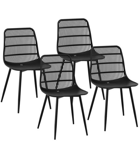 Of u nu uw restaurant, bistro, kantoor of wachtkamer inricht, met de comfortabele stoel STAR_SEAT_09 van Fromm & Starck, de expert voor hoogwaardig kantoormeubilair, kunnen uw gasten comfortabel zitten, waar ze ook zijn. Natuurlijk kunnen u en uw gezin het ook naar uw zin hebben in uw keuken thuis of op het balkon. De zwarte stoel van veerkrachtig kunststof heeft een zitting van 46.5 x 45.5 cm. De rugleuning bestaat uit een doorlopend rooster, waardoor deze bijzonder ademend is en daardoor vooral in de zomer veel comfortabeler om te zitten. De stoelen in deze set van vier kunnen elk tot 150 kg dragen en zullen zelfs bij maximale belasting niet kraken. De ergonomisch gevormde eetkamerstoel met hoge rugleuning nodigt uit tot verpozen - in een stijlvol café of in de pauzeruimte. Het stevige vierpootsframe zorgt ervoor dat de kunststof stoel altijd veilig staat. Kunststof kappen op de vier zwarte stalen poten beschermen het vloeroppervlak en voorkomen vervelende krassen. De gebruikte materialen, waaronder polypropyleen en staal, zijn niet alleen zeer robuust en duurzaam, maar ook zeer onderhoudsvriendelijk. Kies deze tijdloze en elegante set van vier voorgevormde plastic stoelen en geef je interieur een boost! ...