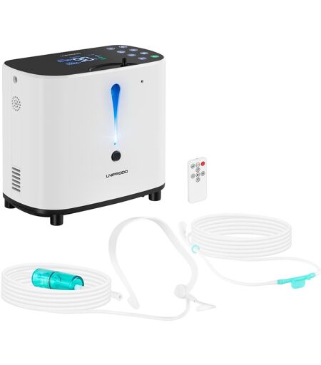 Adem weer vrij - geen probleem met het zuurstofapparaat van Uniprodo. Het zorgt voor meer welzijn en betere prestaties. Hoe het werkt? De zuurstofconcentrator filtert de zuurstof uit de omgevingslucht. Dit verbetert de zuurstoftoevoer. Pas de zuurstoftoevoer met zes vermogensniveaus en twee verschillende inhalatiemogelijkheden volledig individueel aan uw wensen aan. Het zuurstofapparaat voor thuis ondersteunt mensen met chronische longziekten zoals astma en COPD bij ademhalingstherapie. De O2-concentrator is mobiel en licht - net als de bediening. Via het touchscreen of de afstandsbediening kunt u de zuurstofverzadiging van de toegevoerde lucht verhogen tot wel 90%. Op het LED-display kun je op elk moment de ingestelde waarden zien. U kiest zelf hoe u de zuurstof inneemt: via een zuurstofcanule in de neus of via een op het oor gemonteerde inhalator. Het zuurstofapparaat voor thuis is slechts 40 dB luid (afhankelijk van de afstand tot het apparaat). In het dagelijks leven en 's nachts merk je er nauwelijks iets van. Gebruik in geval van nood de geïntegreerde SOS-functie. Het maakt het gemakkelijker voor u om het correct te gebruiken. Met elektrische beschermingsklasse II is de zuurstofgenerator bijzonder veilig. Daarbij komen de zorgvuldige afwerking en robuuste materialen. De bij de accessoires meegeleverde reserveonderdelen, zoals zekeringen en filters, zorgen voor een lange levensduur van het apparaat. Opmerking: de afstandsbediening werkt op CR2025-batterijen, deze zijn niet inbegrepen. Kennis is jouw zuurstof? Lees dan ons artikelWat is een zuurstofapparaat en hoe gebruik ik het? ' en leer thuis alles over de voordelen van zuurstoftherapie! ...