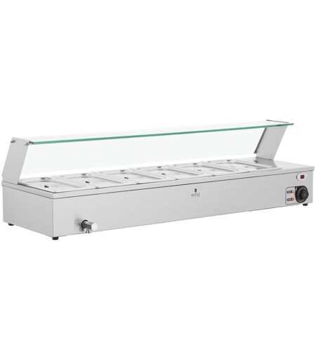 In de bain marie uit het horeca assortiment van Royal Catering kunt u gerechten die al lang warm zijn perfect presenteren. In de 6 Gastronormbakken kunt u alle componenten van een gerecht of meerdere gerechten zoals vlees, vis, groenten, rijst, aardappelen en saus op de gewenste temperatuur houden - zonder risico op aanbranden. De voedselverwarmer dekt optimaal de luxe cateringbehoeften en is geschikt voor gebruik in restaurants, hotels, kantines, buffetten, snackbars, cafetaria's of bejaardentehuizen en klinieken. Het efficiënte 2100 W krachtige verwarmingselement verwarmt het waterbad snel tot de gewenste temperatuur. De draaiknop activeert de automatische thermostaat, die een nauwkeurige temperatuurregeling tussen 30 - 110 °C mogelijk maakt. De voedselverwarmer heeft een aftapkraan voor eenvoudig gebruik. De 6 uitneembare containers (GN 1/3) met deksel bieden een totaal volume van 21 l. Dankzij de volledig uitneembare bakjes kun je de etenswaren direct bij de kookzone vullen en vervolgens in de warmhoudbak plaatsen. Dit bespaart u niet alleen tijd, maar stelt u ook in staat om op elk moment gemakkelijk en professioneel individuele maaltijden bij te vullen. De deksels zorgen ervoor dat de gerechten van bovenaf warm en beschermd blijven. De bain-marie voedselverwarmer heeft een glasbescherming van veiligheidsglas, die je met een paar eenvoudige stappen kunt installeren of verwijderen. De hoes beschermt uw eten en serviesgoed tegen vuil en besmetting - tegelijkertijd zijn de producten voor klanten gemakkelijk te zien of te verwijderen. De warmtecontainer is gemaakt van hoogwaardig roestvrij staal en is zeer duurzaam en bestand tegen corrosie. Het materiaal is onschadelijk voor de gezondheid, gemakkelijk schoon te maken dankzij het extreem gladde oppervlak en daardoor bijzonder hygiënisch. Roestvrij staal heeft ook een uitstekende vermoeidheids- en slagvastheid. ...
