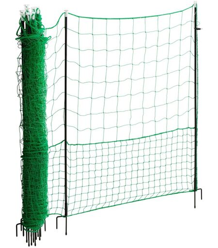 Uw pluimvee buiten houden en uw kippen, ganzen of kalkoenen de beste leefomstandigheden bieden? Zet dan een stuk grond uit met het kippenhekwerk van Wiesenfeld, jouw expert in landbouw en pluimveehouderij! Of het nu op uw boerderij is of bij een bouwaanhanger in de wei, het pluimveehekwerk biedt uw pluimvee een veilige plek waar ze ongestoord kunnen rondlopen en hun voer kunnen pikken. En als u het hek elektrificeert, verhoogt u effectief de bescherming van uw pluimvee. Met de 12 palen van glasvezel bouw je het pluimveehek snel op. Bevestig de palen stevig in de grond met grondhaken en span het net tussen de bevestigingspalen. Dankzij de geïntegreerde vloerstoppers voorkom je veilig dat je pluimvee uit het uitzetgebied ontsnapt of dat dieren zoals vossen binnenkomen. Zet de fiberglas stokken neer zoals je zelf wilt om het pluimveenet met de nodige spanning op te bouwen. Zorg voor een optimale stabiliteit dat de palen niet meer dan 2 m uit elkaar staan. Met een netlengte van 25 m dekt u een groot oppervlak voor uw pluimvee. Combineer eventueel meerdere kippennetten met elkaar of integreer een deur in het verrijdbare kippenhek. Met een schrikdraadafrastering (niet meegeleverd) kunt u het kippenhek bekrachtigen en de bescherming van uw dieren optimaal verhogen. Gebruik de maaswijdte van het pluimveehek van 10 x 10 cm aan de bovenkant en 4,5 x 4,5 cm aan de onderkant om een veilige plek te creëren voor uw kippen, ganzen, kalkoenen of eenden. Dankzij een hoogte van 125 cm klimt uw pluimvee niet over het net. ...