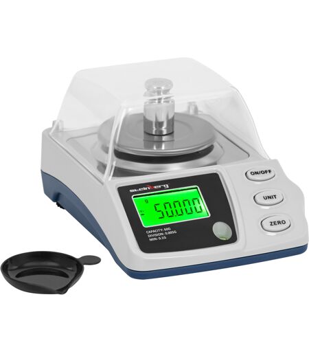 Met de precisieweegschaal met windscherm van Steinberg Systems kunt u nauwkeurig en gemakkelijk het gewicht van goud, munten, edelstenen, thee, specerijen en nog veel meer meten. Dankzij de stevige behuizing en het praktische opbergdoosje is de digitale weegschaal altijd goed beschermd tegen krassen en stoten en kan hij gemakkelijk in elke broekzak worden opgeborgen. Naast mobiel gebruik zijn de kleine weegschalen ook ideaal voor gebruik in scholen, juweliers, laboratoria of keukens. In het productassortiment van Steinberg Systems vindt u nauwkeurige weegschalen voor andere toepassingsgebieden en hoogwaardige industriële apparatuur. Met een nauwkeurigheid van 0,005 g meet de digitale weegschaal nauwkeurig gewichten tot 60 g. Het display wordt snel bijgewerkt in stappen van 0,001 g. Afhankelijk van uw wensen kunt u voor uw metingen ook kiezen uit de eenheden g, mg, ct, oz, ozt, dwt en gn. Naast de talrijke eenheden biedt de precisieweegschaal een breed scala aan functies, waaronder nulstelling, kalibratie, tarreren en wisselen van eenheden, evenals automatische uitschakeling. Dankzij de 9 mm in hoogte verstelbare poten en de geïntegreerde waterpas kunt u de weegschaal nauwkeurig waterpas zetten en nauwkeurige resultaten verkrijgen, terwijl de afneembare hoes extra bescherming biedt voor gevoelige weegobjecten. Voor herkalibratie is een testgewicht (50 g) bij de levering inbegrepen. De grote, verlichte cijfers op het LCD-display maken het gemakkelijk om de waarden af te lezen bij slechte lichtomstandigheden. Bovendien geeft de precisieweegschaal overbelasting aan met een symbool op het display. Dankzij het lage gewicht, de robuuste windbescherming en de werking op batterijen kan de compacte laboratoriumweegschaal overal, onafhankelijk van het elektriciteitsnet, worden gebruikt. Het weegoppervlak met een diameter van 68 mm is gemaakt van hoogwaardig roestvrij staal, gemakkelijk schoon te maken en zeer duurzaam in combinatie met de ABS-kunststof behuizing. Let op: Deze weegschaal is vooraf gekalibreerd maar niet gecertificeerd en voldoet daarom niet aan de handelsnormen. ...