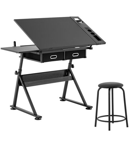 De stabiele tekentafel van Fromm & Starck kan perfect worden aangepast aan individuele eisen voor het instellen van de hoek en de hoogte en biedt een aantal goed ontworpen extra's: Een uitschuifbare bak is er voor een ideale opbergruimte, terwijl het tafelblad zelf bakjes heeft voor pennen, borstels en kleinere gebruiksvoorwerpen. In de twee lades of op de grote plank onder het tafelblad is ruimte voor grotere werkmaterialen. Het strakke ontwerp van de tekentafel vergroot de ruimte in privéwoningen, maar ook in een deel van het kantoormeubilair of in scholen en kunststudio's. Profiteer van professionele werkomstandigheden met de kantelbare tekentafel. Dankzij de royale afmetingen van het tafelblad van 115 x 60 cm kunt u netjes en professioneel zelfs grootschalige tekeningen maken. Het tafelblad zelf is bijzonder robuust en is gemaakt van een 15 mm dikke vezelplaat met PVC-coating. Het kan worden gekanteld in een bereik van 0 tot 70 ° wat betekent dat dit model zowel als klassiek bureau als tekentafel kan worden gebruikt. U kunt de hoogte van het kunstbureau aanpassen tussen 65 en 90.5 cm. Het gepoedercoate stalen frame van het bureau zorgt voor stabiliteit en een lange levensduur. De voeten zijn met rubber bekleed om de vloer tegen krassen te beschermen. Naast de in hoogte verstelbare tekentafel bevat deze set ook een zwarte kruk voor de ideale hoogte, ook met rubberen voetjes. De kunsttafel kan in een mum van tijd worden gemonteerd. Levering bevat alle benodigde montagematerialen en een handleiding. ...