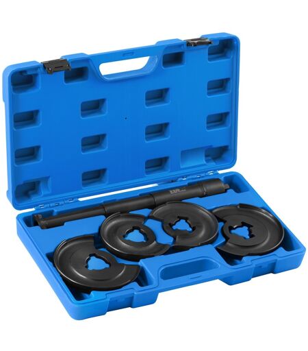 Met de uitschuifbare Veerspanner MSW-HCSC-02 uit de handwerkbenodigdheden van MSW kunt u defecte of versleten McPherson-veerpoten en schokdempers van tal van Mercedes Benz-modellen verwijderen of vervangen zonder de as te demonteren. De voertuigtool stelt zowel automonteurs en autodealers als toegewijde huismonteurs in staat om veilig en professioneel veren te vervangen. De set Veerspanner bestaat uit een uitschuifbare afstandhouder en twee paar klemkoppen. Ze zijn geschikt voor de meeste McPherson-veerpoten met conische en cilindrische veren in tal van Mercedes Benz-auto's. U kunt de Motorvoertuig met veercompressor gebruiken voor zowel de voor- als de achteras. De twee paar klemkoppen bieden contactvlakken met een diameter van 70 tot 150 mm die samen met de telescoopspindel veren van verschillende afmetingen kunnen verschuiven. Dankzij de grote spanwijdte van de spil tot 325 mm, die afhankelijk van het klemkoppenpaar precies aan de veer kan worden aangepast, is dit professionele voertuiggereedschap universeel inzetbaar. De veerplaat kan snel en eenvoudig worden verwisseld zonder de as te demonteren. De spacer is gemaakt van koolstofstaal. De robuuste en krachtige constructie maakt snel en nauwkeurig werken mogelijk. Voor eenvoudig transport wordt de voertuigveercompressor geleverd in een koffer zodat het gereedschap ook direct door de klant kan worden gebruikt. Alle onderdelen van de set liggen klaar voor inlevering in de transportkoffer, waarin ze ook veilig opgeborgen kunnen worden. ...