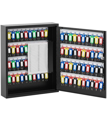 Uw sleutel opnieuw kwijt? Het zou nooit zijn gebeurd met de afsluitbare sleutelkast ST-KB-80P uit de kantoorlijn van Stamony. U kunt tot 80 sleutels netjes en veilig in de sleutelkast bewaren. Dit maakt het moeizame zoeken naar sleutels tot het verleden, of het nu op kantoor van de conciërge op school, in hotels, in fabrieken, in de sportschool of op kantoor is. U kunt de 80 meegeleverde plastic sleutelhangers bevestigen aan de acht in hoogte verstelbare sleutelrails, elk met 10 haken. Elke sleuteltag heeft een klein inscriptieveld met een venster waarin u kunt zien in welke kamer of welk slot de sleutel past. Dankzij de verschillende kleuren en met behulp van het genummerde logblad, kun je snel de sleutel vinden die je nodig hebt in je nieuwe metalen sleutelkast. De metalen sleutelkast is beveiligd met een cilinderslot dat alleen met een van de twee meegeleverde sleutels kan worden vergrendeld en ontgrendeld. Dit beschermt de inhoud van de sleutelkast tegen onbevoegde toegang. Door de vier voorgeboorde gaten in de achterwand van de sleutelkast kunt u deze eenvoudig met vier schroeven en ankers aan de muur bevestigen. De matzwarte afwerking van de behuizing verbergt zowel vingerafdrukken als kleine krassen. De grote afsluitbare sleutelkast is de ideale opslagruimte om uw sleutels schoon, droog en veilig te houden. ...