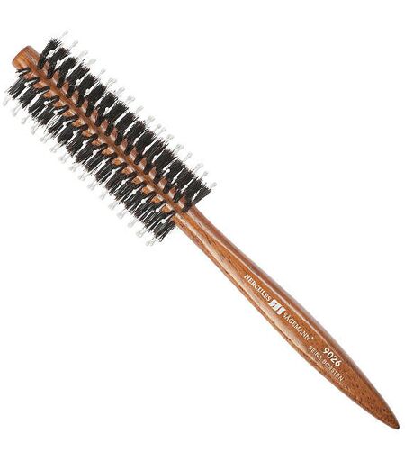 De borstel is bekleed met zuiver zwijnenhaar en ca. 5 mm langere hittebestendige polyamidepennen, voor een optimale rangschikking van het haar vóór het indraaien. De polyamide pinnen zorgen voor een stevige grip van de borstel in het haar, waardoor hij werkt als een kruller. De nopjes op de polyamidepennen zijn zacht voor de hoofdhuid en geven volheid aan het haar. De borstel is uitgerust met een punt om het haar te verdelen, zodat het haar van tevoren in de ideale vorm wordt gebracht. De combinatie van polyamide pinnen en natuurlijke borstelharen geeft het haar een glanzend effect bij het borstelen. ...