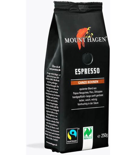 eerde zuurgraad. Het beste resultaat wordt bereikt bij bereiding in een portafilter of volautomaat. Smaakt bijzonder goed als koffiecrème en als creatie met melkschuim. Mount Hagen betrekt alleen fairtrade koffie en steunt zo de kleine koffieboeren in de landen van herkomst van de ruwe bonen. ...