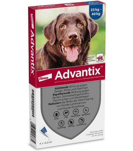 Advantix® Antiparasitica Pipetten tegen vlooien, teken, muggen en steekvliegen, voor honden van 25 kg tot 40 kg. Spot-on oplossing als vlooiendruppels. Niet voor katten! Alleen in Nederland en België leverbaar! ...