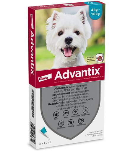 Advantix® Antiparasitica tegen vlooien, teken, muggen en steekvliegen, voor honden vanaf 4 - 10 kg. Pipetten met spot-on oplossing als vlooiendruppels. Niet voor katten! Alleen in Nederland en België leverbaar! ...
