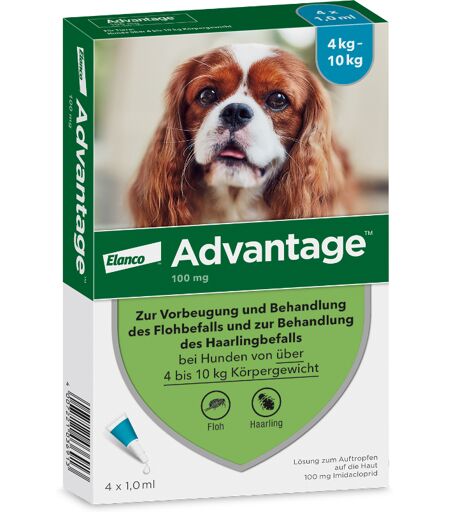 Advantage® vlooiendruppels voor op de huid van honden. Imidacloprid; voor honden met een lichaamsgewicht van 4 tot 10 kg. Tegen vlooien en bijtende vlooien. Uitsluitend in Nederland en Belgiëleverbaar. ...