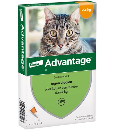 Advantage® Antiparasitica tegen vlooien in de vorm van vlooiendruppels. Oplossing in pipet om te druppelen. Voor katten van minder dan 4 kg. Uitsluitend in Nederland en België leverbaar. ...