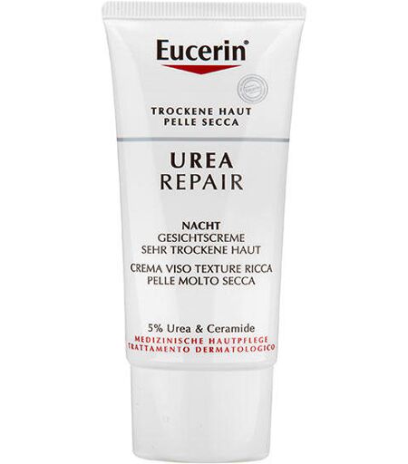 Intensieve verzorging voor de droge en gespannen gezichtshuid. Voedt de huid merkbaar glad en zacht. Ook als regenererende nachtverzorging. Eucerin UREA REPAIR Night Facial Cream 5% is een intensieve gezichtsverzorging voor de droge tot zeer droge en gespannen huid. Ureum en lactaat, twee natuurlijke vochtbindende stoffen, hydrateren onmiddellijk de droge gezichtshuid en verlichten het gevoel van spanning. Het verzacht echter niet alleen de ruwheid, maar maakt de huid ook gladder dankzij de keratolytische werking van het actieve bestanddeel ureum. Aangezien de crème de droogheid, het trekkerige gevoel en de ruwheid vermindert, is zij geschikt voor de verlichting van de symptomen van een droge huid, bijvoorbeeld ten gevolge van psoriasis. Ook voor de ouder wordende huid. Toepassing: Reinig het gezicht en dep de huid droog. Masseer de crème zachtjes in het gezicht en de hals. Elke avond aanbrengen. De huid wordt blootgesteld aan factoren zoals het weer, agressieve reiniging en natuurlijke veroudering. Dit kan leiden tot vochtverlies en dus symptomen van een droge huid: De huid voelt onaangenaam ruw, trekkerig of jeukerig aan of heeft de neiging te gaan schilferen. De producten van de UreaRepair verzorgingsserie zijn verrijkt met urea en andere natuurlijke vochtvasthoudende factoren (NMF) - voor een intensieve toevoer van vocht. Eucerin UreaRepair PLUS verzacht onmiddellijk de tekenen van een droge huid dankzij het unieke Repair PLUS Complex en biedt 48 uur lang langdurige bescherming. Eucerin UreaRepair ORIGINAL biedt u de bewezen en rijke ureumverzorging. Alle producten zijn dermatologisch getest en ook ideaal voor de verzorging van de droge huid op oudere leeftijd, alsook voor de begeleidende therapie bij diverse ziekten zoals keratosis pilaris of diabetes. ...