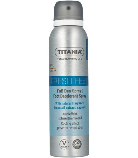 Verkoelend effect, antitranspirant. TITANIA® Foot Deodorant Spray verzorgt de voeten en laat een verkoelend effect achter. Het natuurlijke antitranspiratiecomplex van paardenstaartextract en salieolie vermindert transpiratie. Voedende ingrediënten houden de huid soepel. Gebruik: Indien nodig dagelijks op de voeten sprayen vanaf een afstand van minimaal 15 cm. ...
