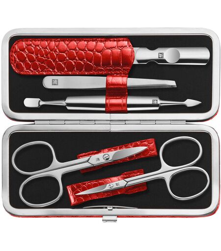 Met de functionele, 5-delige nagelverzorgingsset heb je alles wat je nodig hebt voor verzorgde, mooie vingernagels. Functionele precisie-instrumenten van roestvrij en gepolijst roestvrij staal in een elegante, rode etui met croco-design. De praktische manicureset is uitgerust met vijf corrosiebestendige instrumenten: nagelriemschaar, nagelschaar, schuine pincet, nagelriemduwer en -reiniger en een saffieren nagelvijl. De instrumenten worden netjes opgeborgen in de hoogwaardige etui van echt leer en zijn altijd binnen handbereik. ...