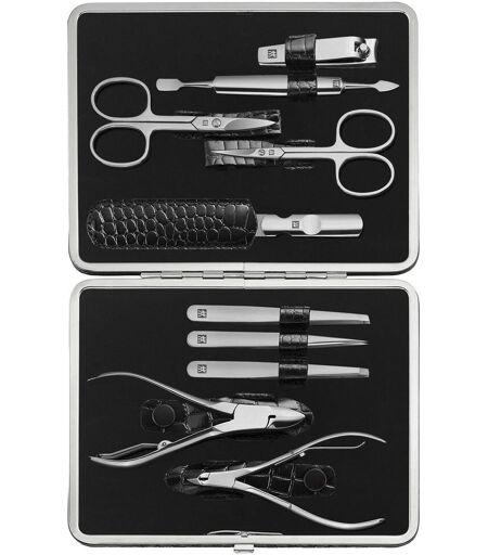 De functionele, 10-delige nagelverzorgingsset biedt een praktische combinatie van hoogwaardige instrumenten voor de verzorging van vinger- en teennagels. Een nagelknipper, nagelriemduwer en -reiniger, nagelschaar, nagelriemschaar, saffier nagelvijl, schuine pincet, rechte pincet, puntige pincet, nagelknipper en nagelriemknipper zijn veilig en netjes opgeborgen in de hoogwaardige, zwarte koehuiden etui in krokodildesign met een metalen frame. De ZWILLING schoonheidsinstrumenten zijn gemaakt van roestvrij, gepolijst roestvrij staal en bieden functionaliteit, duurzaamheid en corrosiebestendigheid in bewezen ZWILLING kwaliteit. ...