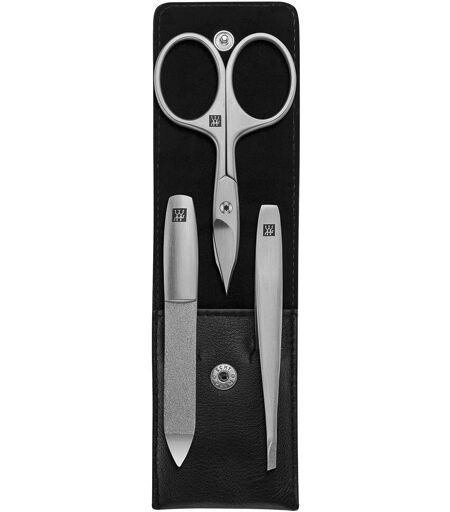 Dankzij het compacte formaat is de professionele, 3-delige premium verzorgingsset de perfecte metgezel op reis en voor nagelverzorging onderweg. In de robuuste, zwart nappaleren etui met drukknoopsluiting zitten een nagel- en nagelriemschaar, een 90 mm saffieren nagelvijl en een schuin pincet veilig opgeborgen. De absoluut precieze vervaardiging uit roestvrij staal met een matte satijnen afwerking en de perfecte ergonomische vorm van de instrumenten zorgen voor een uitstekende duurzaamheid en functionaliteit in een bijzonder aantrekkelijk design. ...