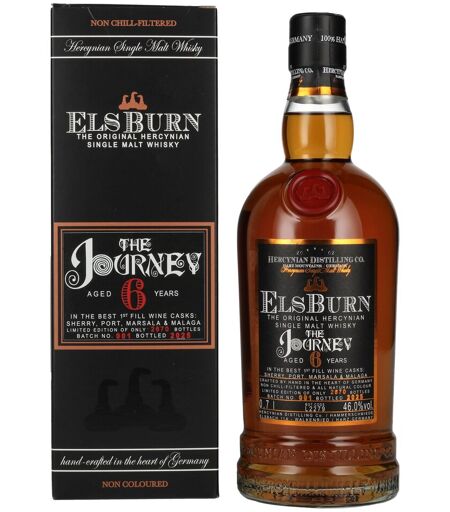 Elsburn The Journey 6 Years Old Single Malt is een speciale botteling uit het Duitse Elsburn-assortiment van de Hercynian Distilling Co. - voorheen Glen Els - uit het Harzgebergte. Deze exclusieve botteling draagt de naam Batch No. 001 (2025) en vert Kleur: Kopergoud met roodgouden reflecties. Neus: Fruitige zoetheid met tonen van gedroogd fruit, honing, karamel en rode bessen. Smaak: Complex en vol met indrukken van geroosterd hout, pure chocolade, sherry, fijne specerijen en een lichte rokeri ...