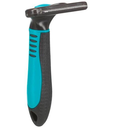 Deze kaardborstel verwijdert dode haren en overtollige ondervacht gemakkelijk en effectief zonder de bovenvacht te beschadigen. Het is bijzonder geschikt voor het gemakkelijk ontvliezen en uitdunnen en wordt gebruikt voor de speciale verzorging van de ondervacht. Het blad is met een eenvoudig klikmechanisme aan het handvat bevestigd, en de currykammen kunnen gemakkelijk worden vervangen. 7 x 15 cm. De meegeleverde eggenkop heeft een breedte van 5 cm. Geschikt voor de volgende vachttypes: Lang haar, zijdehaar of langharige katten: Middellange tot lange, zijdeachtige of dichte bovenvacht met ofwel fijne of zachte, weelderige ondervacht. Voorbeeld langhaar: Collie, Golden Retriever, Berner Sennenhond, Border Collie. Voorbeeld zijdeachtige vacht: Yorkshire Terrier, Setter, Langharige Teckel, Spaniël, Maltezer. Voorbeeld langhaar katten: Main Coon, Noorse Boskat, Perzisch. Kortharige, stockhaired of kortharige katten: Korte tot middellange, gladde, glanzende bovenvacht en fijne, zachte, dichte tot zeer dichte ondervacht. Voorbeeld korthaar: Labrador, Rottweiler, Beagle, Mopshond. Voorbeeld stokhaar: Duitse herdershond, husky. Voorbeeld korthaar katten: Europees, Exotisch Korthaar, Kartuizer, Siamees. Ruwe vacht: Harde, dichte en pezige bovenvacht met korte, zachte, dichte ondervacht, moet regelmatig getrimd worden. Voorbeeld: Ruwharige Teckel, Airdale Terrier, Cairn Terrier, Fox Terrier, Schnauzer. ...