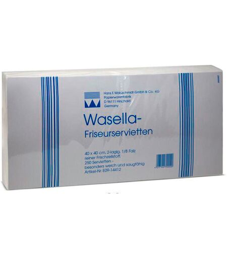 Wasella kappersservetten, bijzonder zacht en absorberend. 40 x 40 cm, 2-laags, 1/8 vouw. Inhoud verpakking: 1 x 250 servetten. Gemaakt van zuivere zuivere pulp. Veiligheidsvoorschriften: Steek de kappersservetten niet aan en houd ze uit de buurt van open vuur, kaarsen of andere warmtebronnen. De servetten zijn niet geschikt voor consumptie. Zorg ervoor dat kinderen de servetten niet in hun mond stoppen of inslikken. ...