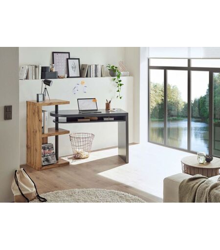 Multifunctioneel home-office bureau gecombineerd met boekenkast en voorzien van draaibaar bureaugedeelte. Afmetingen BxDxH ca: Draaibare bureaublad 115 cm x 50 cm x 76 cm Boekenkast 50 x 40 x 94 cm Compeet uitgedraaid is lengte 146 cm Kleurcombinatie: kastombouw in eiken kleur bureaublad in grijs Metalen zuil in grijs Materialen: bureaublad van MDF gelakt kastombouw van MDF voorzien van decor eiken afwerking ...