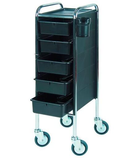 Zwarte trolley met 5 werkdozen en 1 haardrogerhouder. Verchroomd frame, 4 zwenkwielen, met zijpanelen. De laden kunnen aan beide kanten uitgetrokken worden. Met grote zwenkwielen. Buitenafmetingen: H. 92,5 cm, B. 29 cm, D. 35 cm. ...