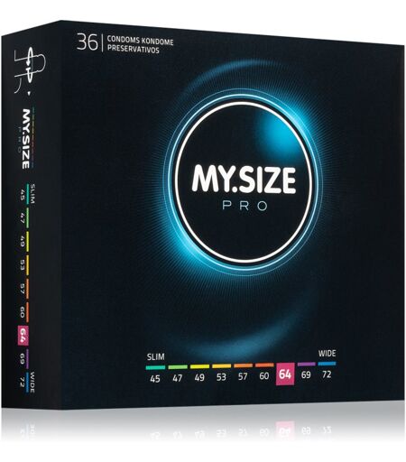 MY.SIZE 64 mm Pro, 36 st, Condooms voor Mannen, Een intense beleving tijdens het vrijen is ook mogelijk met bescherming. De ultradunne condooms MY.SIZE 64 mm Pro zorgen voor maximaal comfort en verhogen de gevoeligheid. Kenmerken: biedt maximaal comfort en een intense belevenis dunner materiaal voor betere gevoeligheid glijdt goed dankzij de lubricatie zonder zaaddodend middel Ingrediënten: natuurlijk latex van de rubberboom Hoe te gebruiken: Gebruik een glijmiddel op waterbasis. ...