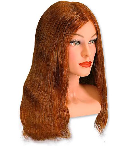 Hoofd met medium blond menselijk haar, natuurlijke haarval en lichte natuurlijke golf. Met wimpers. Haarlengte ca. 35-40 cm. Gebruikt: Mode, knippen, kapperswerk, permanenten en kleuren. ...