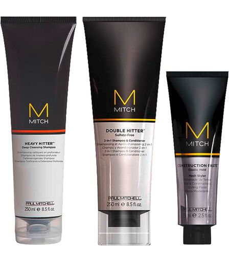 De Paul Mitchell Mitch For Men Elastic Hair Set bestaat uit: Paul Mitchell Mitch Heavy Hitter Diep Reinigende Shampoo 250 ml.Paul Mitchell Mitch Double Hitter 2 in 1 Shampoo en Conditioner 250 mlPaul Mitchell Mitch Construction Paste Mesh Styler 75 ml Diepreinigende shampoo: Merkbare dieptereiniging voor dagelijks gebruik, verwijdert vuil en productresten. Revitaliseert en reinigt grondig zonder de natuurlijke oliën van de hoofdhuid aan te tasten. Ruikt heerlijk fris naar cederhout en agave. pH 5.5. Toepassing: In vochtig haar masseren en vervolgens uitspoelen. 2 in 1: Milde reiniging en verzorging in één stap voor vol, gezond uitziend haar. Voedende ingrediënten verbeteren de doorkambaarheid. Sulfaatvrij, pH 6,0. Toepassing: In het haar masseren, laten schuimen, uitspoelen - klaar! Styler: Styling crème met elastische versteviging. De soepele consistentie is ideaal om vorm te geven en te scheiden. Perfect voor wilde "undone" looks. Versterkende ingrediënten zorgen voor optimale fixatie. Voedende actieve ingrediënten maken het haar soepel en handelbaar. Schone afwerking zonder productresten. pH 5.5. Toepassing: Verdeel een kleine hoeveelheid in vochtig of droog haar en style zoals gewenst. Mitch - MITCH® is een hoogwaardige haarverzorgingslijn, op maat gemaakt voor de moderne man. ...