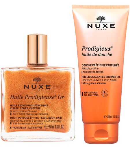 De NUXE Prodigieux Must Have Set bevat: 1 x NUXE Huile Prodigieuse Or Multi Purpose Dry Oil, 50 ml1 x NUXE Prodigieux Douche Olie, 200 ml NUXE Huile Prodigieuse Or Multi Purpose Dry Oil: Huile Prodigieuse®, het cultproduct van NUXE, is de nummer 1 olie in Franse apotheken. De zogenaamde multifunctionele droge olie voor gezicht, lichaam en haar voedt, regenereert en verzacht. 7 waardevolle plantaardige oliën, waaronder tsubaki en arganolie, zorgen voor een heerlijk gevoede huid en glanzend haar. De fijne glansdeeltjes geven huid en haar een natuurlijke gloed. De unieke textuur van de droge olie wordt onmiddellijk opgenomen en de verzachtende geur zorgt voor een echt verwenmoment. Het hele jaar door geschikt voor alle huid- en haartypes. NUXE Prodigieux Shower Oil: Deze doucheolie reinigt je huid op milde wijze en voorziet haar van optimale hydratatie. Zoete amandelolie zorgt voor een fluweelzachte huid. Met een zonnige, sensuele geur van warm zand met noten van oranjebloesem, magnolia en vanille. Op basis van de cultgeur van Huile Prodigieuse® zorgt deze douchegel voor een echt verwenmoment. Een frisse gelei-textuur voor een moment van sensuele ontspanning. ...