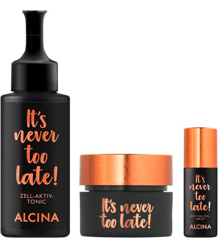 De Alcina It's never too late Facecare Set bevat: 1 x Alcina Het is nooit te laat Cell Active Tonic 125 ml1 x Alcina Het is nooit te laat gezichtscrème 50 ml1 x Alcina Het is nooit te laat anti-rimpelserum 30 ml Tonic: De celactieve tonic is een multitalent: snel te gebruiken, verwijdert droge huidcellen en neemt talgresten en vette glans van de huid weg, zodat de volgende verzorgingsproducten beter doordringen en werken. Bovendien stimuleert het fruitzuur dat het bevat de huidcellen om sneller te regenereren en rimpels te minimaliseren. Toepassing: Dagelijks 's morgens en/of 's avonds op het gezicht aanbrengen met een wattenschijfje. Gezichtscrème: De nieuwe anti-rimpel gezichtscrème met collageen Matrixyl activeert het huideigen herstelproces, maakt rimpels glad en verbetert de elasticiteit en veerkracht van de huid. Co-enzym Q10 zorgt voor een gezonde huidgroei, vitamine E voorkomt verdere rimpels en verbetert het vochtgehalte. Het resultaat: een vitale en jongere huid. Toepassing: Dagelijks 's ochtends en 's avonds aanbrengen op gezicht, hals en decolleté. Serum: Het anti-rimpelserum met Matrixyl dringt diep door in de huidlagen en activeert de huideigen herstelprocessen. De huid wordt elastischer en veerkrachtiger, rimpels verminderen. De combinatie met de gezichtscrème versterkt het anti-rimpel effect en geeft uw huid een hogere rijkdom. Voor de gemengde of licht vette huid kan het serum ook alleen worden aangebracht. Toepassing: Dagelijks 's ochtends en 's avonds aanbrengen op een gereinigde huid. Gebruik eventueel daarna een gezichtscrème. ...