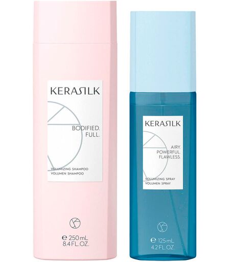 De KERASILK Volume Set bevat: 1 x KERASILK Volume Shampoo, 250 ml1 x KERASILK Volume Spray, 125 ml KERASILK Volume Shampoo VOLUMEVOL. KRACHTIG. Versterkende, zacht reinigende shampoo met Biomimetische Zijde en Blauwe Lotus Extract. Onze 100% veganistische formule creëert de ideale basis voor een voller en sterker haargevoel. PRESTATIES/VOORDELEN: Versterkt het natuurlijke volume zonder het te verzwarenBiedt gewichtloos vocht voor een voller haargevoelVerwijdert vuil, talg, olie, verontreinigende stoffen en productresten en is zacht voor de hoofdhuidNeutraliseert hard water om minerale resten te voorkomen, waardoor het haar in een evenwichtige, neutrale staat blijft. TOEPASSING: Schuimen en uitspoelen. IDEAAL VOOR: Fijn, zwak, plat haar. CLIMANEUTRAL PRODUCT: Dit product is CO2-gecompenseerd. VEGANE FORMULATIE: Geen ingrediënten van dierlijke oorsprong. 91,3% van de ingrediënten zijn van natuurlijke oorsprong en 97,4% zijn biologisch afbreekbaar. VRIJ VAN: siliconen, sulfaten, kleurstoffen, microplastics, minerale oliën. KERASILK Volume Spray LICHT. KRACHTIG. MERKLOOS. Ultralichte spray met Biomimetische Zijde en Blauwe Lotus Extract. Onze 100% veganistische formule transformeert futloos, plat haar in natuurlijk uitziend, vol en handelbaar haar - met meer volume en natuurlijke glans. PRESTATIES/VOORDELEN: Meer volume en volheid met een natuurlijk licht haargevoel.Niet-verzwarende verzorging en vocht voor gemakkelijk, zacht ontwarrenZachte fixatie en antistatisch effectNatuurlijke glansHittebescherming TOEPASSING: Verstuif in handdoekdroog haar. Niet uitspoelen. IDEAAL VOOR: Slap, plat haar. CLIMANEUTRAL PRODUCT: Dit product is CO2-gecompenseerd. VEGANE FORMULATIE: Geen ingrediënten van dierlijke oorsprong. 93% van de ingrediënten is van natuurlijke oorsprong en 98,5% is biologisch afbreekbaar. VRIJ VAN: Siliconen, sulfaten, kleurstoffen, microplastics, minerale oliën. ...