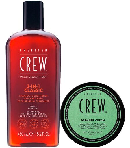 De American Crew Vormgevende Crème + 3in1 Classic Set bevat American Crew Vormgevende Crème, 85 gAmerican Crew 3-in-1, 450 ml Forming Cream: Medium fixatie met medium glans en uitstekende gladheid. Styling crème voor alle haartypes. Geeft stevigheid, body en volume. Verzacht en zwelt de haarschacht op, waardoor het haar dikker lijkt. Spoelt uit zonder residu achter te laten. 3-in-1: shampoo, conditioner & body wash in één product. Het verheldert de huid, reinigt het haar op milde wijze en verwijdert overtollige olie en vuil zonder het haar te verzwaren. ...