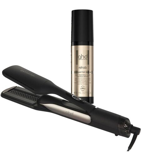ghd heteluchtstyler duet style 2-in-1 zwart + ghd rehab damaged hair repairer 95ml set. De revolutionaire Air-Fusion™ technologie is een unieke combinatie van geavanceerde interne aerodynamica met 4 intelligente platen in een op maat gemaakte ghd stylingkamer. Een deskundig ontworpen luchtrooster creëert een ultrageconcentreerde luchtstroom voor snellere styling en ongekende haarresultaten met slechts één apparaat. De slimme Infinity Sensors reageren op de behoeften van je haar en behouden een gelijkmatige temperatuur van aanzet tot punt voor superieure droogprestaties terwijl de natuurlijke vochtbalans van je haar behouden blijft. Van nat haar naar gladde styling zonder hitteschade, bruis of verbrande geur, voor ongekend mooie en gladde haarresultaten tot 48 uur lang met 42% meer vochtbescherming. EU stekkerAir-Fusion™ technologieShine Shot™-modusLaag geluidsniveauUniek luchtfilterAutomatische slaapstand na 30 minuten2,7 m lang snoerHittebestendige beschermkap2 jaar fabrieksgarantie De ghd rehab damaged hair repairer is een herstellend leave-in product dat beschadigd haar herstelt met de kracht van warmte. De geavanceerde vloeibare serumformule wordt geactiveerd door de hitte van je ghd-tool en levert tot 99% minder breuk1 - direct sterker en zachter2 haar met zichtbaar gezondere glans. Deze leave-in behandeling herstelt haarbeschadiging voor veerkrachtiger en gezonder aanvoelend haar.3 1 vergeleken met haar gewassen met een niet-voedende shampoo.2 Consumententest, sep'23. 78% van 100 vrouwen was het ermee eens dat ghd rehab hun haar sterker deed aanvoelen en 84% was het ermee eens dat het haar zachter was in vergelijking met voor het gebruik van rehab en warmtestyling.3 Consumententest, sep'23. 72% van 100 vrouwen was het ermee eens dat ghd rehab het haar steviger maakt en 81% was het ermee eens dat het haar gezonder aanvoelt in vergelijking met voor het gebruik van rehab en warmtestyling. ...