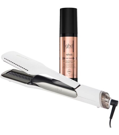 ghd heteluchtstyler duet style 2-in-1 wit + ghd rehab dry hair nourisher 95ml set. De revolutionaire Air-Fusion™ technologie is een unieke combinatie van geavanceerde interne aerodynamica met 4 intelligente platen in een op maat gemaakte ghd stylingkamer. Een deskundig ontworpen luchtrooster creëert een ultrageconcentreerde luchtstroom voor snellere styling en ongekende haarresultaten met slechts één apparaat. De slimme Infinity Sensors reageren op de behoeften van je haar en behouden een gelijkmatige temperatuur van aanzet tot punt voor superieure droogprestaties terwijl de natuurlijke vochtbalans van je haar behouden blijft. Van nat haar naar gladde styling zonder hitteschade, bruis of verbrande geur, voor ongekend mooie en gladde haarresultaten tot 48 uur lang met 42% meer vochtbescherming. EU stekkerAir-Fusion™ technologieShine Shot™-modusLaag geluidsniveauUniek luchtfilterAutomatische slaapstand na 30 minuten2,7 m lang snoerHittebestendige beschermkap2 jaar fabrieksgarantie De dry hair nourisher uit de ghd rehab lijn is een voedende behandeling die droog, pluizig haar transformeert met de kracht van warmte. Ervaar verzorgd, glad1 en intens gehydrateerd haar3 - elke dag. De geavanceerde formule wordt geactiveerd door de hitte van je ghd tool voor tot 3x minder kroes2 en een gezonder haargevoel.3 1 Consumententest, sep'23. 85% van de 114 consumenten is het ermee eens dat het haar gladder aanvoelt met ghd rehab, 83% is het ermee eens dat het haar zachter aanvoelt dan vóór de warmtestyling en het gebruik van rehab.2 Frizz lab test met ghd rehab en ghd duet style vergeleken met natuurlijk gedroogd haar.3 Consumententest, sep'23. 71% van de 114 consumenten is het ermee eens dat ghd rehab langdurige hydratatie biedt en 74% is het ermee eens dat het haar gezonder aanvoelt dan voor de warmtestyling en het gebruik van rehab. ...