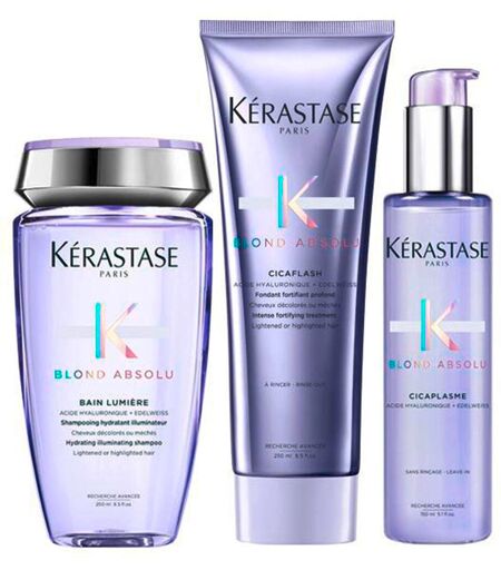 Het Kérastase Blond Absolu Trio bevat: 1 x Kérastase Blond Absolu Bain Lumière, 250 ml1 x Kérastase Blond Absolu Cicaflash, 250 ml1 x Kérastase Blond Absolu Cicaplasme, 150 mlBlond Absolu Bain Lumière: hydraterend, glansbevorderend haarbad voor blond, gestreept of natuurlijk blond haar. Hydrateert de haarvezel intensief en reinigt het haar voor een glanzend resultaat. Toepassing: Breng de shampoo aan op nat haar. Massage in. Spoelen. In geval van contact met de ogen, onmiddellijk uitspoelen. Blond Absolu Cicaflash: Intensieve, herstellende verzorging voor blond of gehighlight haar. De conditionerende eigenschappen van een masker gecombineerd met de lichte textuur van een conditioner: bouwt het haar op en beschermt het, voor een zijdezacht haargevoel. Toepassing: Masseer in handdoekdroog haar na een haarbad. Werk in lengtes en uiteinden. 3 tot 5 minuten laten inwerken. Bij contact met de ogen, onmiddellijk grondig spoelen. Blond Absolu Cicaplasme: heropbouwend serum met hittebescherming voor blond of gehighlight haar. Herstructureert structureel beschadigde haarvezels en geeft het haar soepelheid en een stralende gloed voor blond haar. Verrijkt met UV-filters en antioxidanten. Uitgebreide bescherming: biedt bescherming tegen hitte tot 230 °C*. *Instrumentele test. Toepassing: s Morgens: aanbrengen op vochtig haar vóór het föhnen of drogen. Werk in lengtes en tips voor verfijning.s Nachts: Een nacht laten inwerken voor een optimale haaropbouw. Bij contact met de ogen, deze onmiddellijk en grondig spoelen. ...