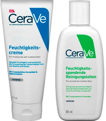 1 x CeraVe Moisturizing Cleansing Lotion, 88 ml: CeraVe Moisturizing Cleansing Lotion reinigt de huid op milde wijze. De niet-schuimende lotion verwijdert effectief vuil en olie en is niet-comedogeen. Het bevat een combinatie van drie essentiële ceramiden 1, 3 en 6-II, die de beschermende barrière van de huid weer opbouwen en de huid weer zacht en fluweelachtig maken. De actieve bestanddelen, zoals ceramiden en hyaluron, worden de hele dag door vrijgegeven door het gepatenteerde afgiftesysteem van actieve bestanddelen en geven de droge huid haar welzijn terug. Toepassing: Reinigingslotion in de handpalmen gieten, op de vochtige huid aanbrengen en zachtjes inmasseren. Afspoelen. Geschikt voor volwassenen en kinderen. Vermijd het gebied rond de ogen. Bij contact met de ogen, grondig uitspoelen. 1 x CeraVe vochtinbrengende crème, 177 ml: Deze rijke crème met een zachte poederachtige finish hydrateert de huid een hele dag lang en helpt de beschermende barrière van de huid te herstellen. CeraVe Moisturizing Cream voor de droge tot zeer droge huid bevat drie essentiële ceramiden en hyaluronzuur. Toepassing: Zo vaak als nodig royaal aanbrengen. CeraVe Moisturizing Cream kan over het hele lichaam en gezicht worden gebruikt. Geschikt voor volwassenen en kinderen. CeraVe: Ontwikkeld in samenwerking met dermatologen In 2005 deden vooraanstaande Amerikaanse dermatologen onderzoek naar een nieuw, baanbrekend huidverzorgingsproduct dat de beschermende barrière van de huid op een innovatieve manier zou versterken. Hun streven was om dermatologische doeltreffendheid te combineren met een maximaal gebruiksgemak - voor een zijdezachte huid. Zo werd CeraVe geboren. CeraVe Technologie Multivesicular Emulsion Technology (MVE): een revolutionair afgiftesysteem dat geleidelijk, laagje voor laagje, kostbare vochtinbrengende ingrediënten vrijgeeft om de huid langdurig te hydrateren. Hoe CeraVe is ontstaan Met de combinatie van ceramiden en het gepatenteerde MVE-systeem voor het vrijgeven van ingrediënten, lanceerde CeraVe haar drie belangrijkste producten: Moisturizing Cream, Moisturizing Lotion en Moisturizing Cleansing Lotion. CeraVe vandaag Momenteel biedt CeraVe een uitgebreide lijn verzorgingsproducten voor gezicht en lichaam. CeraVe, is hoogwaardige huidverzorging voor iedereen. Ontwikkeld met de expertise van dermatologen. ...