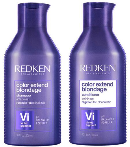 Redken Color Extend Blondage Shampoo 300 mlRedken Color Extend Blondage Conditioner 300 ml Color Extend Blondage Shampoo: Verfraai uw blonde haar met de Color Extend Blondage Shampoo. De build-up shampoo is de perfecte milde reiniger voor blond en gebleekt haar en werkt tegen ongewenste gele & oranje tinten. De anti-geeltint shampoo biedt kleurbescherming en geeft het haar een schitterende glans. Toepassing: U moet handschoenen dragen om de shampoo aan te brengen. Verdeel het verzorgingsproduct over vochtig haar, even laten schuimen en vervolgens goed uitspoelen. Voor een langduriger resultaat: herhaal het proces en laat het schuim 3 tot 5 minuten intrekken. Dan goed spoelen. Color Extend Blondage Conditioner: Redken Color Extend Blondage Conditioner biedt kleurbescherming en neutraliseert ongewenste gele en oranje tinten in blond en gebleekt haar. Bovendien wordt het haar van binnenuit versterkt en verstevigd door het Triple Acid Proteïne Complex. De conditioner voor gekleurd en natuurlijk blond haar werkt het best in combinatie met de Color Extend Blondage Shampoo. Gebruik ook het rijke Redken Color Extend Blondage Express Mask indien nodig voor een perfecte glans en zachtheid. Toepassing: Breng de conditioner aan op vochtig haar na het wassen. 3 tot 5 minuten laten inwerken. Spoel grondig. Draag geschikte handschoenen. Mode, inspiratie, innovatie - dat is Redken 5th Avenue NYC. Redken haarverzorgingsproducten zijn afgestemd op verschillende behoeften en garanderen een eenvoudige maar optimale haarverzorgingsroutine - bij de kapper en in uw eigen badkamer. Ontdek de perfecte verzorging voor uw haar en ervaar de professionele Redken expertise nu eenvoudig thuis. ...