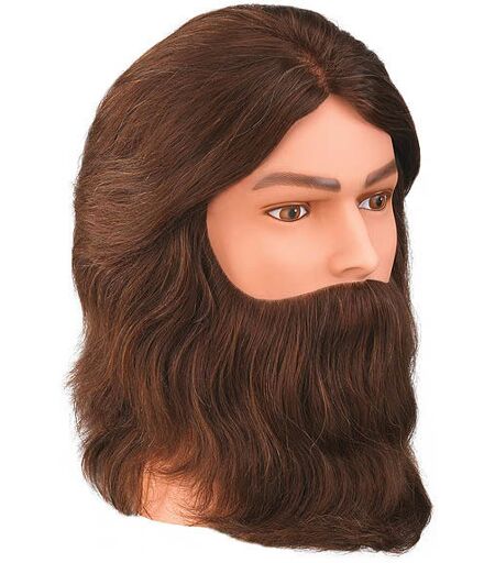 Hoofd met lichtbruin menselijk haar met natuurlijke haarval en baard. Haarlengte ca. 20 cm. Gebruik: knippen en trimmen van baarden, bleken, verven, kappen en föhnen. ...