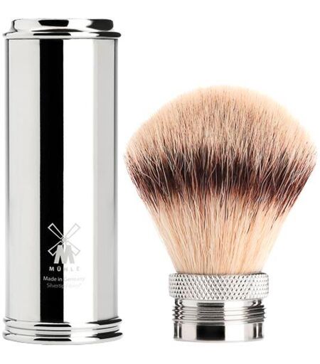 De MÜHLE REISE scheerkwast bestaat uit de Silvertip Fibre® kwastkop en een verchroomde handgreep in reisformaat. Het materiaal - chroom Het oppervlak is corrosiebestendig, bijzonder duurzaam en heeft een kostbare, verleidelijke glans. De borstelkop - Silvertrip Fibre® Silvertip Fibre® zijn synthetische vezels van hoge kwaliteit en vertegenwoordigen een wereldwijde innovatie uit eigen ontwikkeling, aangezien ze sneller drogen en bestand zijn tegen scheerzepen en -crèmes. De volledig veganistische vezel is ook iets gemakkelijker te gebruiken dan natuurlijk haar, aangezien hij een bijzonder romig en weelderig schuim vormt met slechts een kleine hoeveelheid scheerzeep of -crème, waardoor hij zeer zuinig in gebruik is. REIZEN - stijlvol en gemakkelijk op te bergen Uitgerust met de beste kenmerken van de "large" serie, maar toch bijzonder functioneel en licht, onze speciale serie voor scheren op reis. Onderweg zijn de uitgeschroefde borstels goed beschermd in hun fraai gevormde behuizing van geanodiseerd aluminium of verchroomd metaal. De Silvertip Fibre® kwaliteit, die bijzonder snel droogt en slijtvast is, dient als bekleding. ...